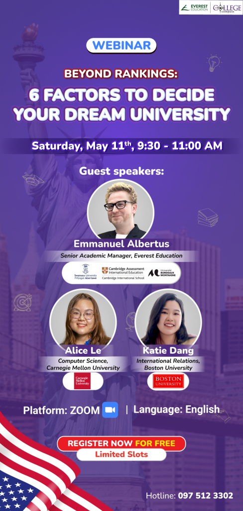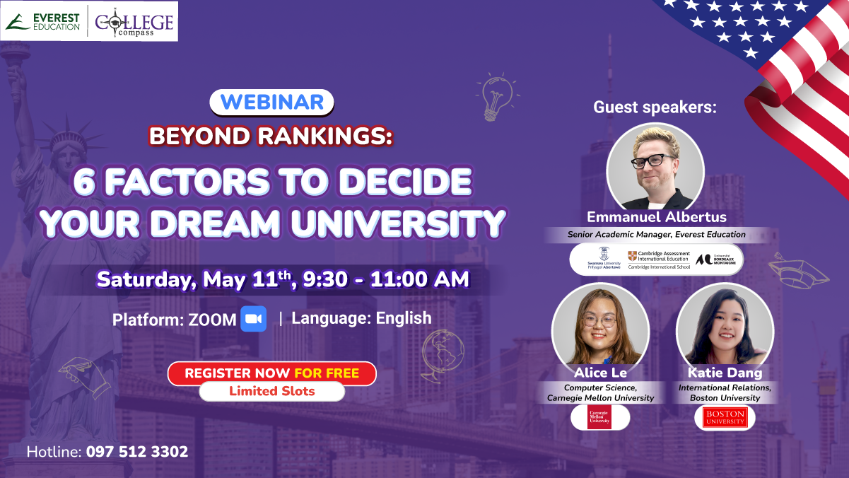Đặc biệt, quý Gia đình sẽ có cơ hội đặt lịch TƯ VẤN TRỰC TIẾP lộ trình du học cùng thầy Emmanuel Albertus, hoặc nhà Đồng Sáng lập Everest Education và Cố vấn Học thuật Cấp cao của College Compass  thầy Don Le  thầy Tony Ngo sau khi tham gia sự kiện.