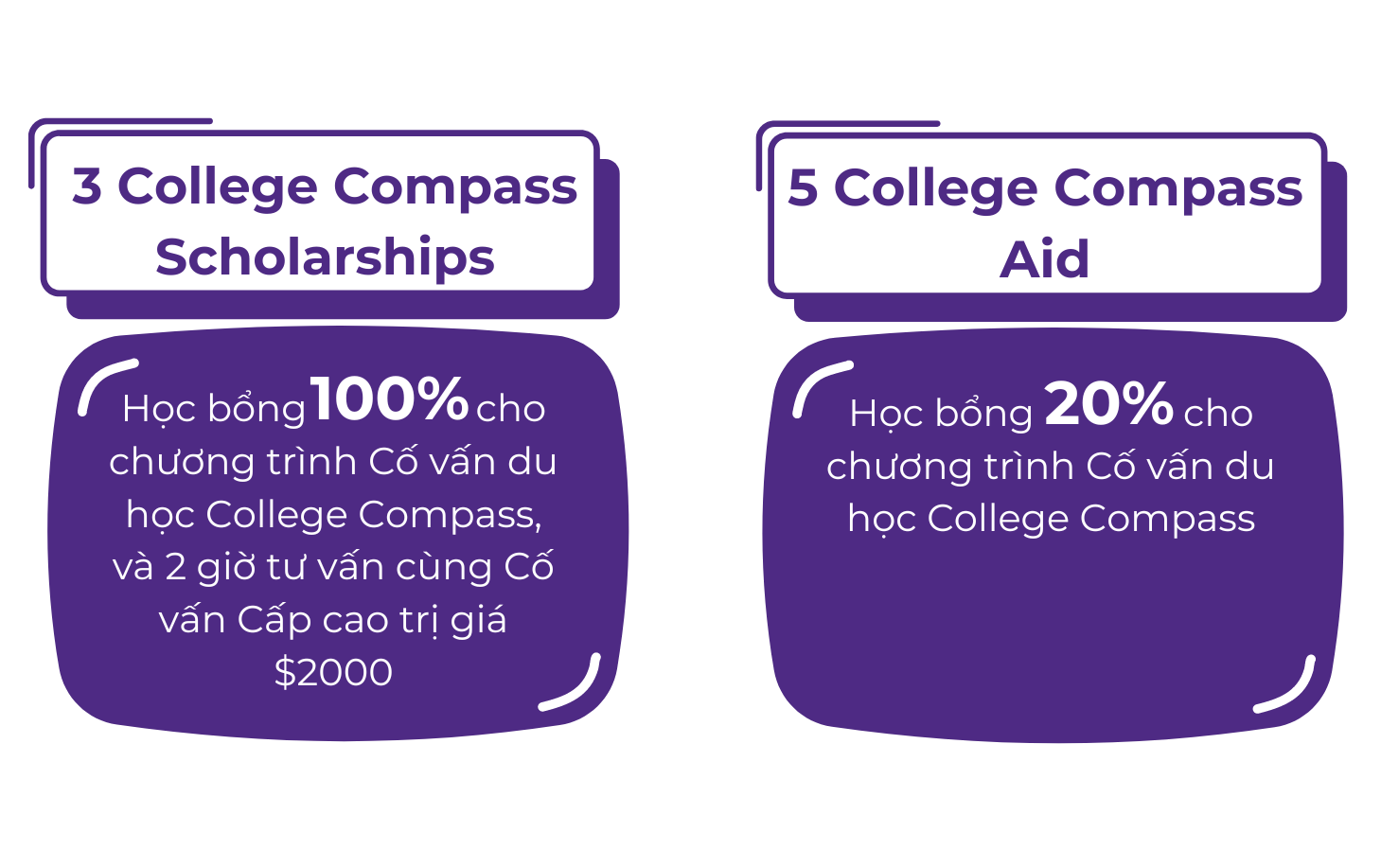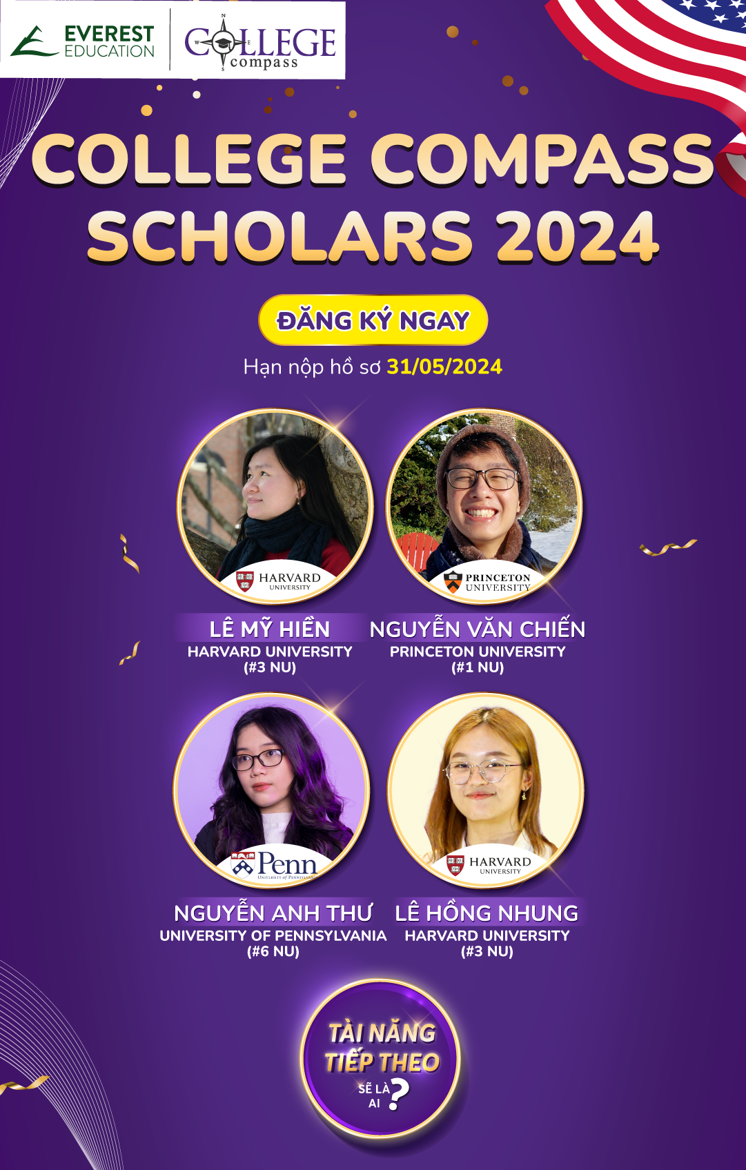 Chương trình Học bổng College Compass Scholars (CCS) đã trải qua 6 mùa từ năm 2018. Kể từ đó, chương trình đã thành công truyền lửa cho nhiều học sinh Việt Nam có tham vọng, tài năng và đạt được thành tích cao. College Compass Scholars những năm trước ghi nhận được số liệu đáng kinh ngạc: 100% học sinh được nhận vào các trường đại học mơ ước và 80% học sinh đậu vào các trường đại học hàng đầu #30 của Mỹ, bao gồm các trường danh tiếng như Princeton, Harvard và UPenn, đồng thời nhận được học bổng trị giá hàng nghìn đô.