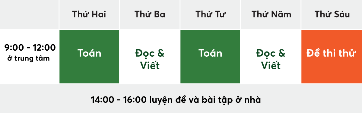 Với mô hình cấp tốc chú trọng vào đào sâu kiến thức nền môn Toán và Đọc & Viết tiếng Anh đồng thời trang bị kỹ năng làm bài thi, kết hợp trải nghiệm bài thi mô phỏng, giúp học sinh học chắc, hiểu sâu và linh hoạt ứng dụng vào bài thi thực tế.