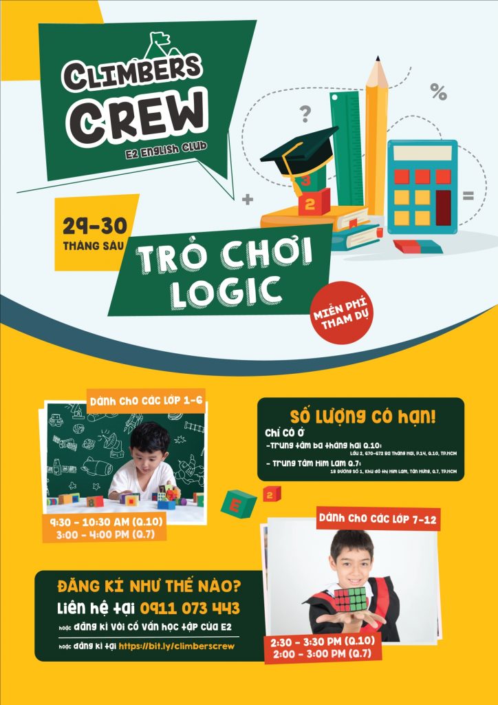 (*) “Trò chơi Logic” là một trong những hoạt động của câu lạc bộ tiếng Anh Climbers Crew được tổ chức bởi Everest Education. Chúng tôi cung cấp miễn phí không gian học tập sáng tạo dành cho học sinh ở tất cả độ tuổi, giúp các em rèn luyện khả năng giao tiếp tiếng Anh thông qua chuỗi các hoạt động thú vị. Các chương trình và chủ đề sẽ được thay đổi theo từng tuần. Để biết thêm lộ thông tin chi tiết, vui lòng tham khảo thêm tại http://e2.com.vn/vi/cau-lac-bo-tieng-anh-e2-climbers-crew/